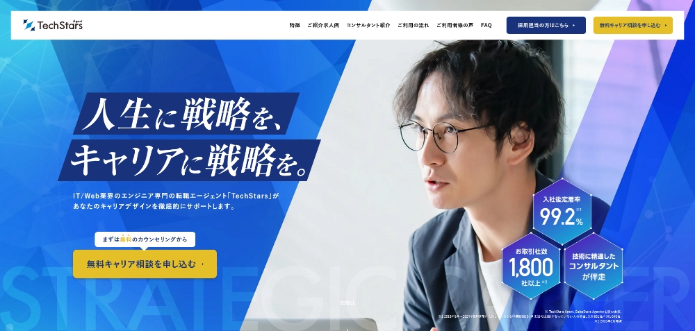 転職エージェントの良し悪しを左右するのは「転職エージェントの質」です。いくら多くの求人を抱えていたとしても、転職エージェントの質が悪ければ条件に合う求人を紹介してもらうことはできませんし、的確なアドバイスをもらうこともできません。プログラマーの求人を探しているのであれば、コンサルタントの質が高いと評判のIT特化型の転職エージェント「TechStars」がおすすめです。